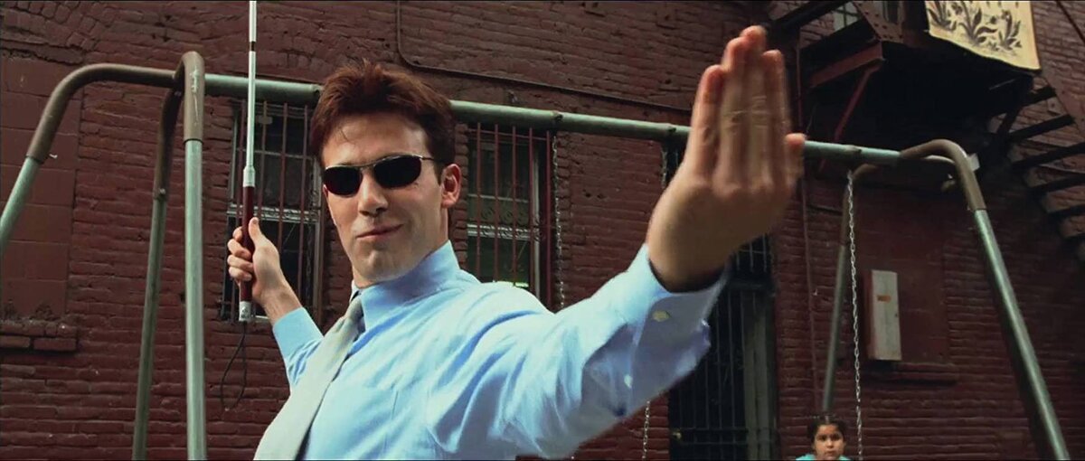 Спецэффекты в фильме вовсе не так плохи, как кажутся. Особенно хорошо реализовано «зрение» слепого адвоката Мэтью Мёрдока. Радарное зрение из комиксов заменили на сонарное, и получилось не плохо. Полеты его на вьющемся тросе из универсальной трости ничуть не хуже полетов Питера Паркера, разве что более мускулистый Мёрдок не имеет той подростковой пластики, характерной для Паука. Ну да так даже и лучше, взрослее что ли…