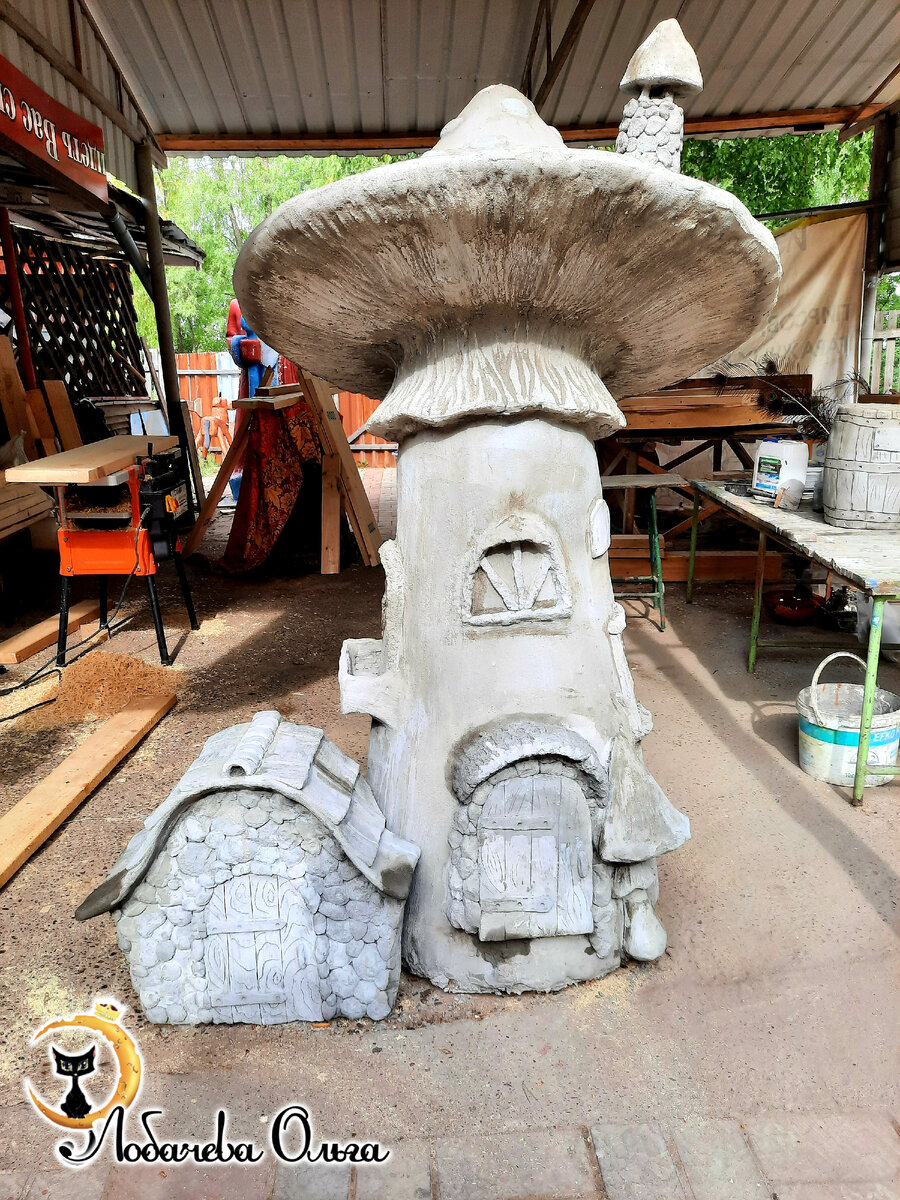 Грибная поляна из бетона . Доброго времени суток добрым людям, моим феечкам сердечный приветик. Меня спрашивают, куда я пропала ... я не пропала мои дорогие. Жара ... она мешает работать . Она обволакивает, не даёт двигаться в нормальном ритме . Но ...ни смотря на это обстоятельство , я по уши погружена в работу . И вот результат этой не простой , рабочей недели . Новый домик грибок Мухоморчик полностью вылеплен, со всеми деталями , и остался сушиться до понедельника. Скульптура высокая , около 2 метров . В ней много интересных деталей , например балкончик. В него будут помещены маленькие горшочки с мелкими , ампельными цветами . Рама одного из окошек выполнена из вето чек , я нарисую к ним листья . Из окон гонимые ветерком развеваются занавески . На стволе гриба табличка , на которой будет написан адрес - Грибная поляна 2 . Возле грибочка не обычный грибок , домик с черепичной крышей . Мне захотелось сделать такой .... незнаю почему ... может потому что я художник и я так вижу 😄💞.