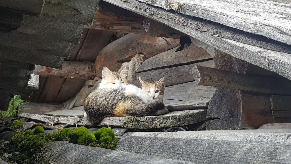 Наше северное лето в этом году было жарким, поэтому кошечкам было жарко, и им приходилось искать прохладу по крышей сарайчика: Кошка Пуся с дочкой Мусей - обе "счастливой" разноцветной окраски. Хотя Муся уже большая, она всё еще сосёт молочко у своей мамы: Кошечки проводят время вместе. В основном они нежатся на теплых мосточках или на крыше сарайчика: "Ну что же ты, Мусенька, так далеко лежишь? Иди, хорошая, ко мне!"- говорит кошка-мама. Иногда кошечки пристраиваются на крылечке! Но их любимое место - под крышей сарайчика: Пуся- кошечка в "годах", ей уже 13 лет, а Муся родилась весной. Пуся ласковая и любит, когда её гладят, с удовольствием спит рядом с человеком ( и даже на человеке): Муся же пугливая, на руки сразу не идет, поймать её практически невозможно - убежит, а погладить можно только в компании с мамой Пусей. Пугливость Мусеньки объясняется тем, что её мама с рождения прятала доченьку в подполье, и вывела "в свет" уже достаточно большой. К счастью, кошечки все время вме
