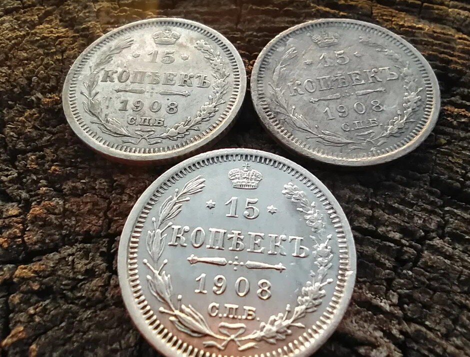Чем примечательна монета номиналом 15 копеек, датированная 1908 годом? Прежде всего тем, что она серебряная. Серебро это такой металл, который на целый ранг поднимает статус монеты в глазах граждан, которые не сталкивались с нюансами коллекционирования монет Российской Империи. Но что такое серебро для коллекционера? Не более, чем самый обычный металл. Да и "серебро" это относительное, так как материал - биллон, т.е. серебра лишь половина. У меня имеется три монетки 1908 года номиналом 15 копеек. Одна из них лежит в коллекции "условной погодовки" (я еще собираю серебро очень осторожно, так как тема для меня дорогая) По картинке можно сказать так: первая сверху - не мытая, вторая сверху - была черная, но стала вот такой, нижняя - мытая с любовью и лаской, так как обе короны (аверсе и реверсе) были мне любы. Каталог монет России говорит, что в 1908 году было отчеканено 29 миллионов монет номиналом 15 копеек. Чеканкой занимался Санкт-Петербургский монетный двор. Но тираж - это или по