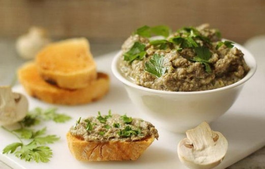 Ингредиенты Пошаговый рецепт классического грибного паштета Шаг 1: Отделяем примерно 25 граммов сливочного масла и выкладываем в большую сковородку. Ставим на плиту растапливаться. Пока нарезаем головку лука любыми кусочками, в данном случае форма и размер не важен. Высыпаем в масло и начинаем обжаривать. Чеснок нарезаем пластинками, кидаем за луком. Шаг 2: Вымытые грибы режем и отправляем минутки через две к луку. Сначала слегка обжариваем, затем накрываем и доводим до готовности в течение 15 минут. В конце крышку нужно снять, остатки воды выпарить. Шампиньоны солим, перчим. Шаг 3: Остужаем грибы с луком, отправляем в кухонный комбайн и измельчаем, постепенно добавляя оставшееся сливочное масло. Растапливать его не нужно. Взбиваем все вместе, пробуем паштет на вкус, можно еще посолить. Шаг 4: Укроп просто нарезаем мелкой крошкой и высыпаем в паштет, размешиваем. Перекладываем в контейнер, закрываем и охлаждаем. Используем для смазывания тостов, бутербродов, наполнения тарталеток и лю