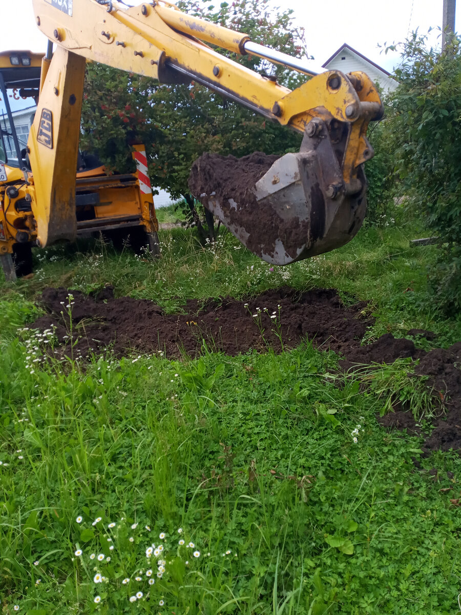 Добрый день, друзья. Пришло время заняться канализацией. После долгого перелопачивания всём известного сайта, я понял, что буду заказывать трактор для закапывания бетонных колец. У меня в городе в ручную закопать одно кольцо стоит 3000 рублей (но это аккуратнее) , а трактор 2500 в час. При этом тракторист обещал управиться за 3-4 часа, а копание в ручную грозились вылезти в сумму 24000 рублей, поэтому решение очевидно. Заказал восемь колец с крышками планируя сделать два колодца по четыре кольца. Настал день Д. Немного неудобная позиция для трактора и поэтому яма получилась хорошо побольше чем я планировал, но тракторист об этом предупредил сразу. Плодородного слоя почвы около 40-50 см, дальше идет глина. После того как выкопали на глубину примерно трёх колец - пошла вода. Решил дальше не испытывать судьбу, делать колодцы по три кольца, а потом, если не будет хватать, сделать третий колодец. Сам процесс фоткать не получилось. Надо было подкатывать кольца к трактору, промазывать