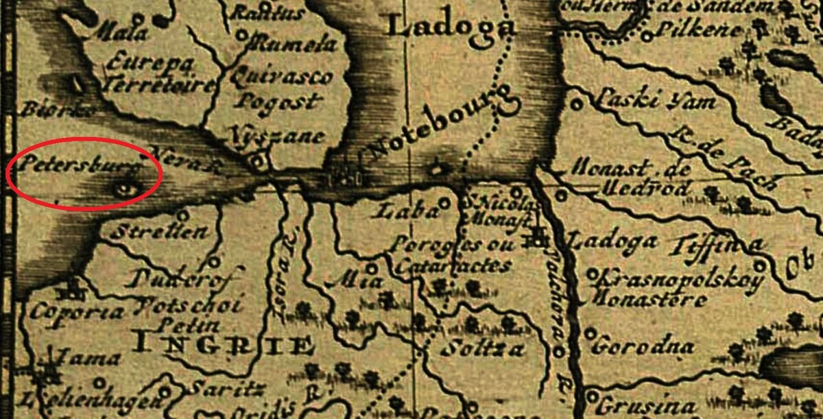 На редкой голландской карте из Атласа конца 17 века. Kaart van het oostelijk deel van de Finse Golf, met een inzetkaart van het eiland Kronstad (1682 -...), Иоаан Ван Кулен(Keulen, Johannes van). Петербург уже присутствует на карте в виде надписи "Nyen Skantz of Petersborg", что переводится как Невская (по другой версии: Новая) крепость Петербурга. То есть устье Невы это не сам Петербург в то время, а один из районов разбросанного по Маркизовой луже Петербурга.