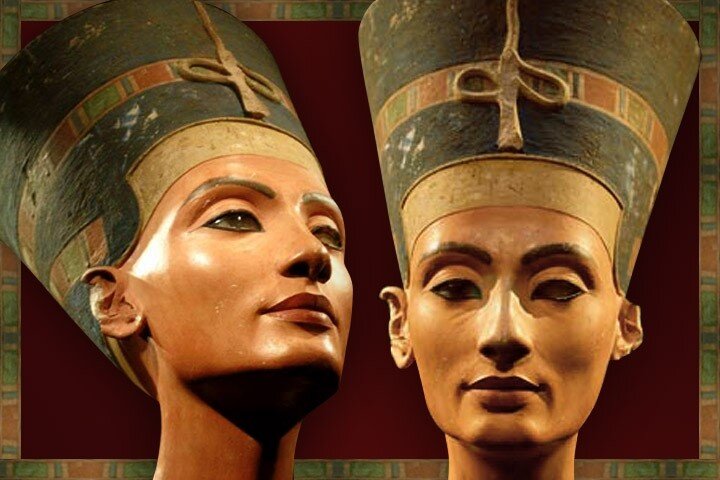 Царица Нефертити. Наконец я выбрала и подобрала куклу для воплощения моей идеи - создать царицу Египта несравненную Нефертити 18 династии. Мачеху, которая вырастила самого известного по своей гробнице фараона Тутанхамона. По описанию и скульптуре работы Тутмоса у царицы правильные черты лица: черные правильной формы брови, карие миндалевидные глаза, чуть припухлые правильной формы губы и длинная шея. Царица не отличалась особой стройностью: была не высокого роста, имела широкие бёдра и совсем не тонкую талию. А как же иначе - родила шесть дочерей! Я долго искала подходящую куклу и, наконец нашла. Она полностью подходит под описание, так как пока я не прошиваю и не прорисовываю лица. И началась подборка тканей. А самое главное царицы - это её знаменитый головной убор - высокая корона синего цвета с отделкой из цветной ленты и змеи. Только у этой царицы, жены фараона Эхнатона, был такой головной убор. Я начала с него. Основа - картон в несколько слоев, ткань и золотистая лента, раскраш