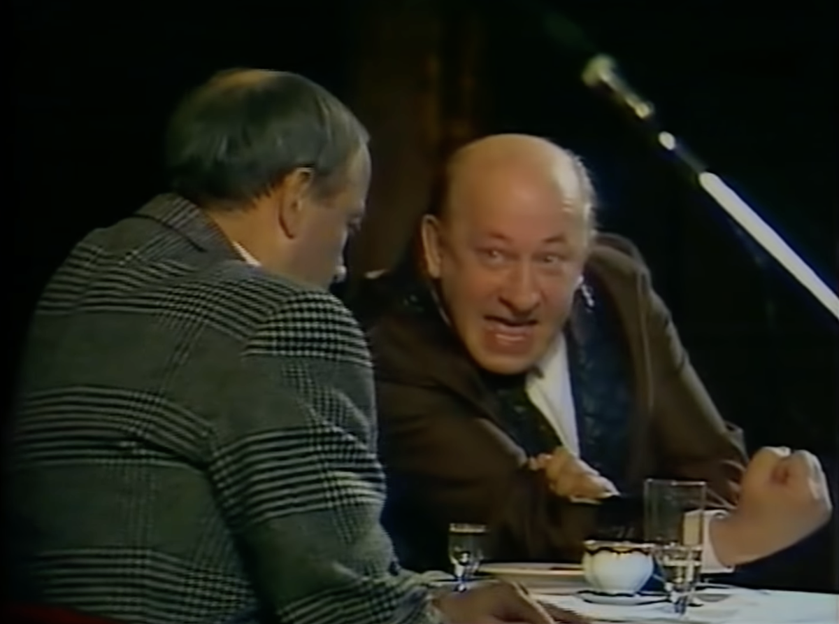 На что можно смотреть бесконечно? На огонь. На текущую воду. На облака. На лицо ребёнка... На многое. Не знаю, как вы, друзья, а я добавил бы в этот список Евгения Александровича Евстигнеева. Не "игру Евстигнеева", а вот просто – его самого. В миниатюре, которую мне хотелось вместе с вами вспомнить сегодняшним вечером, он даже не особо "в роли". Глаза озорные, видно, что он тут, с нами, ещё чуть-чуть – и сам улыбнётся резонёрству своего персонажа. Нет, он не играет "до полной гибели всерьёз", он лишь "работает", "лицедействует". И то же самое делает Валентин Иосифович Гафт, но... Но их же невозможно сравнить! Гафт просто "смешит" (и публика благодарно реагирует на его размашистые, чтобы хорошо было видно из зала, ужимки, а Евстигнеев – вроде бы как просто живёт. Сидит за столом, ест, пьёт, говорит... Кажется, будто он и есть такой в жизни. Будто не помещик Камышев, "любитель празднословить" перед нами, а взаправдашний Евгений Александрович, как он есть. И даже хочется прислушаться к с