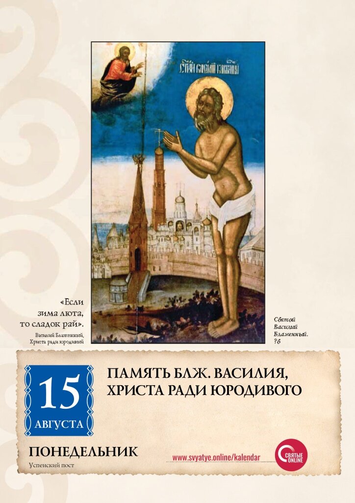 Блаженный Василий родился около 1464 года в подмосковном селе Елохове (ныне Елоховская улица Москвы), около церкви св. Никиты Мученика. Его родители – Иаков и Анна – были простыми крестьянами. Подросшего мальчика отдали учить сапожному ремеслу. Уже в это время он вел подвижническую жизнь, занимался умной молитвой и успел стяжать благодатные духовные дары. Когда ему было 16 лет, в мастерскую пришел посадский человек и попросил сделать сапоги, которых бы хватило на несколько лет. Василий улыбнулся, хозяин потом его спросил почему. «Мне странным показалось, что посадский человек заказывает себе сапоги на несколько лет, когда умрет завтра», – сказал молодой человек. Слова сбылись, но после этого юноша не захотел оставаться ни в мастерской, ни в родительском доме. Он принял на себя подвиг юродства, который продолжался в общей сложности 72 года. В зной и мороз ходил святой нагой и босой по улицам Москвы, стараясь быть ближе к обездоленным, нищим и калекам. Часто он удалялся в башню в Китай-г