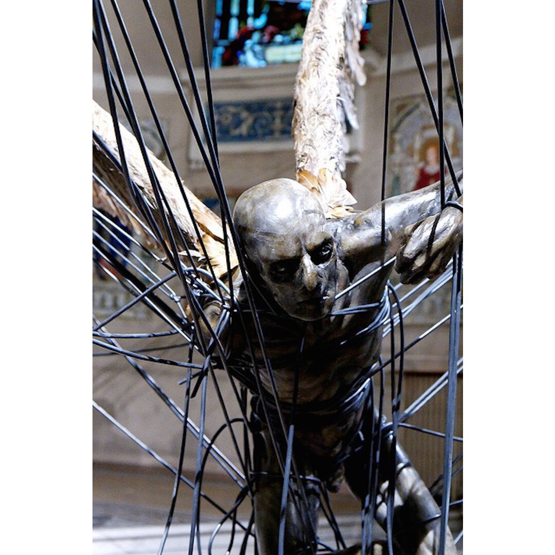 В 2008 в лондонской церкви святой Троицы Мельбурне скульптор Пол Фрайер создал инсталляцию «Да будет свет». Самый известный ее объект — это восковой «Люцифер (Утренняя звезда)» с огромными крыльями из белых перьев. У нас его назвали «Пойманный дьявол в проводах электропередачи». Скульптура Люцифера символизирует человека, подверженного ошибкам (опутавшие его провода), и последующий за этим хаос и ужас. Зал с витражами и куполообразным потолком является идеальным местом для развертывания этой драматической аллегорической сцены. Между прочим, Люцифер является отсылкой к более ранней работе художника. За год до инсталляции в церкви он создал скульптуру «Мученик» (илл. 5). Это поэтический памятник первой жертве электромеханической революции. Простой монтер умер от падения на провода на Бродвее в 1889 году. Его смерть от электрического тока проложила путь к введению в США казни на электрическом стуле. Церковь не использовалась по своему прямому порядка 50 лет, поэтому художник не осквернил