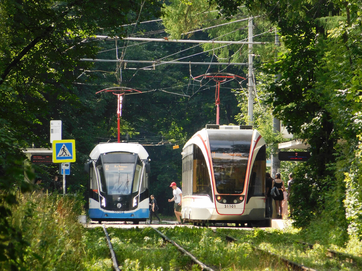 Начинаем нашу прогулку с Главной аллеи, оттуда будем двигаться вдоль линии в сторону метро Партизанская. Первым встреченным трамваем стал 31227 на маршруте 12. Маршрут обслуживается депо имени Русакова: