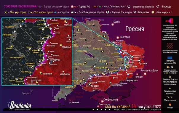 Продолжаем следить за происходящем в зоне СВО. Сейчас речь пойдет про среду, 10 августа 2022 года, четверг.11 августа 2022 года, пятницу 12 августа 2022 года, субботу 13 августа 2022 года и воскресение 14 августа 2022 года. Это 168, 169, 170, 171, 172 дни СВО. Новостей было немного, но они есть. И также есть надежда, что хороших новостей станет больше. Впрочем, все по порядку.
