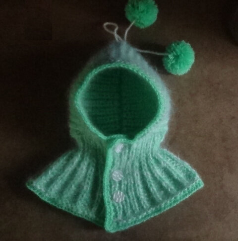 Вяжем простую и теплую шапочку-капюшон спицами. Для работы понадобится 100 гр. любой пряжи с толщиной примерно 240 м. на 100 гр., мохер, спицы №3, крючок №2, пуговицы