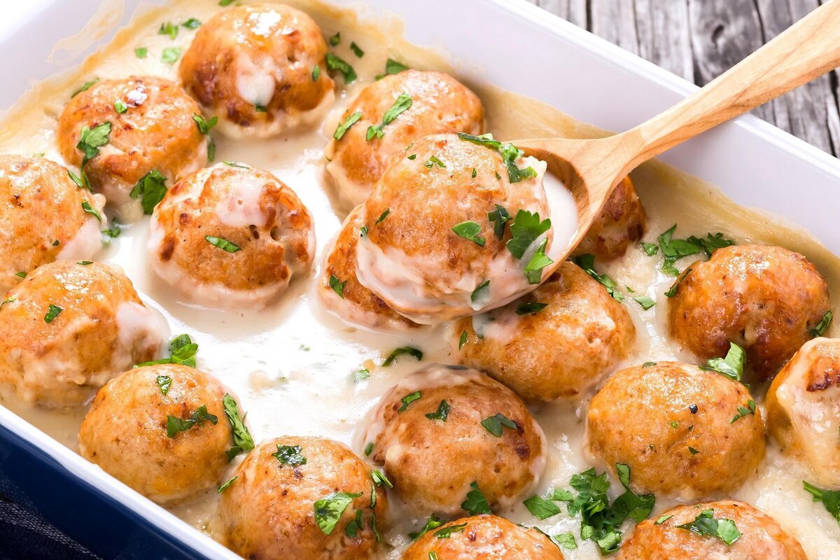 - В сковороде растапливаем кусочек сливочного масла и обжариваем шампиньоны. Затем вливаем сливки комнатной температуры и выкладываем фрикадельки. Тушим на небольшом огне под крышкой около 10 минут периодически помешивая.