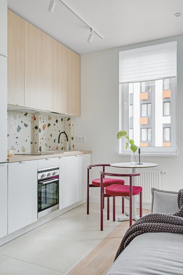 Чаще всего в небольших квартирах проживает один человек или небольшая семья, поэтому на такое количество жильцов можно использовать технику меньших размеров: посудомойку и стиральную машину на 45, трех- или двухконфорочную плиту. Это позволит прилично сэкономить место. Однако стоит понимать, что на двухконфорочную плиту вы не сможете поставить одновременно две большие кастрюли. Скорее всего, влезет небольшая кастрюлька и маленькая сковородка.