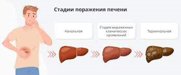 При этой болезни, клетки печени-гепатоциты разрушаются и замещаются грубой соединительной тканью.
