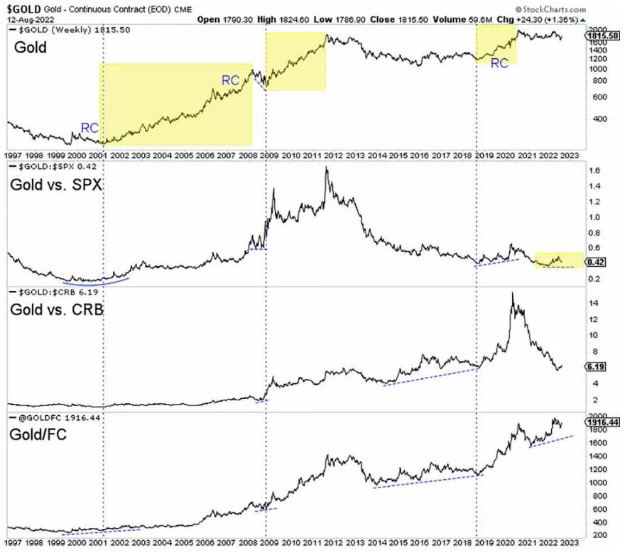 💬🌕 Наблюдение: Джордан Рой-Бирн рассказывает о ключевых фундаментальных факторах для цикла золота и в какие периоды драгметалл демонстрирует самый крупный прирост. Падающие или отрицательные реальные процентные ставки являются фундаментальной движущей силой для золота, и обычно они представляют собой побочный продукт слабого фондового рынка и экономического спада. Но сегодня хотелось бы сосредоточиться на более широком цикле золота и на том, в какие моменты драгметалл показывает лучшие результаты. Важно отметить, что цикл золота имеет особое значение для золотодобытчиков. За последние несколько десятилетий наблюдалось три цикла: с 2001 по 2007 год, с 2008 по 2011 и с 2018 по 2020. Как правило, они разворачиваются вокруг медвежьих рынков акций и/или рецессий. ‼️ Примечание: обычно, но не всегда, во время спада золото опережает рисковые активы (акции, сырьевые товары, валюты). Это обычно предшествует повышению номинальной доходности, а также опережающему росту акций золотодобывающих ко