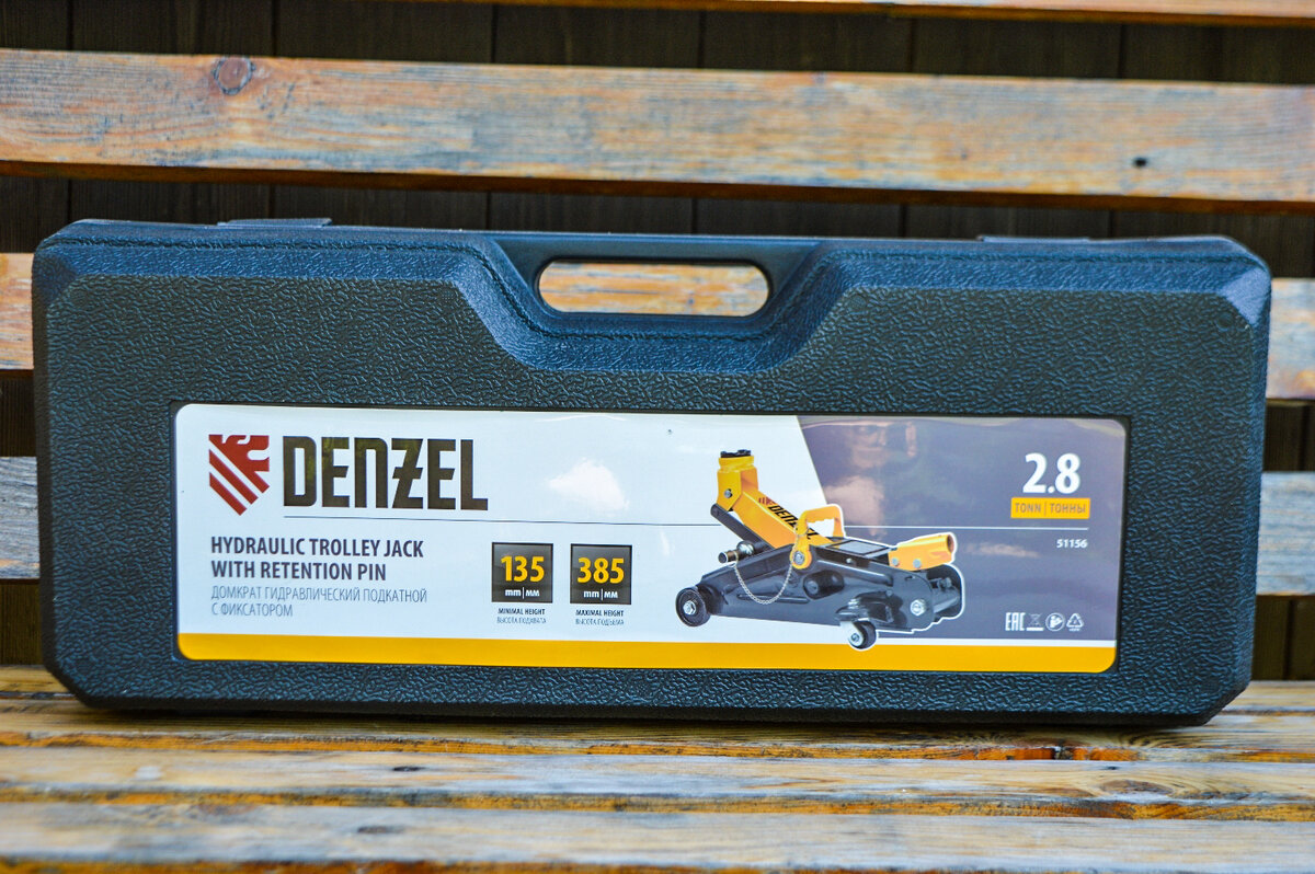 Я изучил характеристики нескольких устройств, и самым надежным и отвечающим моим запросам оказался подкатной гидравлический домкрат Denzel 51156. Он может поднимать грузы весом до 2,8 тонны, на высоту до 385 мм, что позволяет обслуживать все автомобили со стандартным дорожным просветом. Кроме того, модель оснащена двойным страховочным фиксатором для удержания груза на высоте 305 и 370 мм.