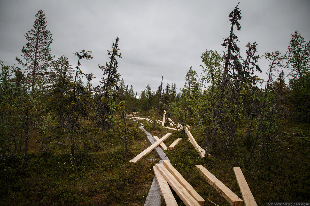 Ближе к вечеру — идём на гору Кивакка. Решаем взять с собой газовую плитку и поужинать на вершине горы. Упаковываем всё в рюкзак, но в итоге оставляем его в машине у начала тропы — никто не хочет его тащить. Лень. К нашему общему счастью, маршрут на Кивакку значительно короче чем на Нуорунен. И хотя лень в очередной раз пытается вклиниться в наши планы, уверенно начинаем наш маленький поход. Подъём занимает около часа. Тропа — в хорошем состоянии. Но её всё равно активно обновляют. Чувствуется, что и здесь не обходится без финнов. Погода портится — тучи сгущаются, начинает накрапывать лёгкий дождик. До кучи ещё и ветер поднимается. Наверху — холодно и неуютно. Но видно далеко. В правой части следующей фотографии хорошо видна гора Нуорунен. Ещё правее, за ней, можно различить пологую вершину сопки Валтаваара, расположенную уже в Финляндии. Озеро Пяозеро (по-фински — Pääjärvi; pää — голова, järvi — озеро). Его название можно перевести как «головное» озеро, а если быть точнее — то главное