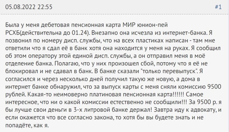 Перевыпуск банковской карты обычно не сопряжён с трудностями или дополнительными расходами. Но не в случае с Россельхозбанком, если судить по истории одного из пенсионеров, которому перевыпуск карты обошёлся в 9 500 рублей. Один из клиентов Россельхозбанка рассказал о своём опыте перевыпуска карты на форуме Banki.ru. История клиента Россельхозбанка. Фото: banki.ru 9 500 рублей за перевыпуск карты Со слов клиента, у него была «Пенсионная карта UnionPay + Мир», срок действия — до января 2024 года. В какой-то момент карта исчезла из банковского приложения. Когда пенсионер позвонил оператору, ему рассказали, что он сдал карту в банк, хотя пластик был на руках. Оператор кол-центра посоветовал обратиться в отделение, где ему сказали, что выход только один — перевыпустить карту. Через несколько дней он пришёл в офис банка и забрал новенькую карту. Придя домой, с удивлением обнаружил, что со счёта списано 9 500 рублей за выпуск пластика. Пенсионер собирается обратиться к адвокату, чтобы подать