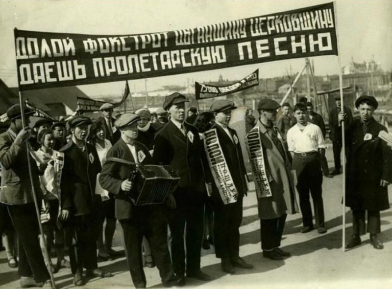 Демонстрация под лозунгом «Долой фокстрот, цыганщину, церковщину, даёшь пролетарскую песню!». Москва, 1932 год