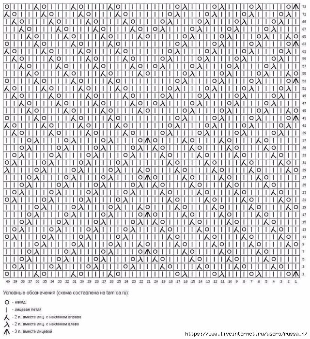 Связан он из нако калико — очень нежный полухлопок, лёгкий в носке и уходе. Но отлично подойдёт всё тот же органический хлопок от газзал, либо хлопок с шелком от фибранатура. Мои спицы номер 5, но я вяжу очень плотно, резинка на 3.5), а на всё про все ушло 2 моточка. Немного о схеме. В ней указаны только нечётные ряды. Чётные вяжем по рисунку. В моем топе 4 таких раппорта в ширину. 1 ряд в схеме = 73 ряду. Довязав все 74 ряда, продолжаем вязать с 3го. Горловина здесь классика — убавки в каждом втором. Пройма 3+3+2+1(закрыла в каждом втором ряду 2 раза по 3 петли, и далее в каждом втором 1 раз 2петли и один раз 1 петлю) для переда и такая же для спинки.