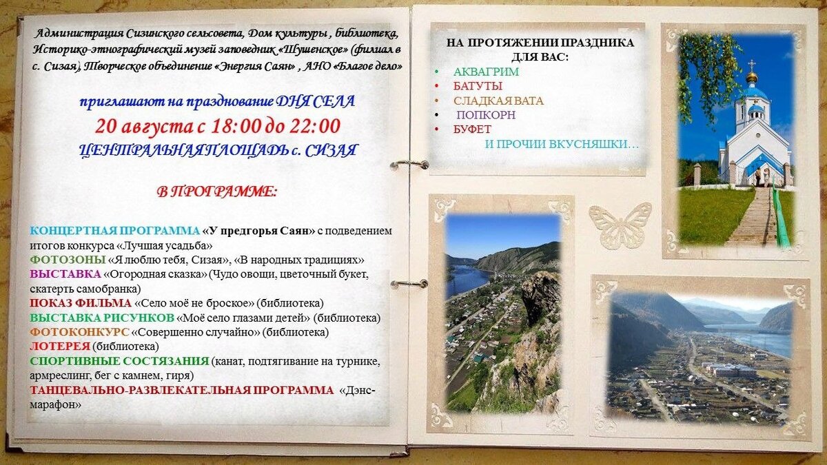 Друзья! Приезжайте на день села в Сизую 20 августа! Там состоится концерт . Будет выставка. Лотереи и фотоконкурс .