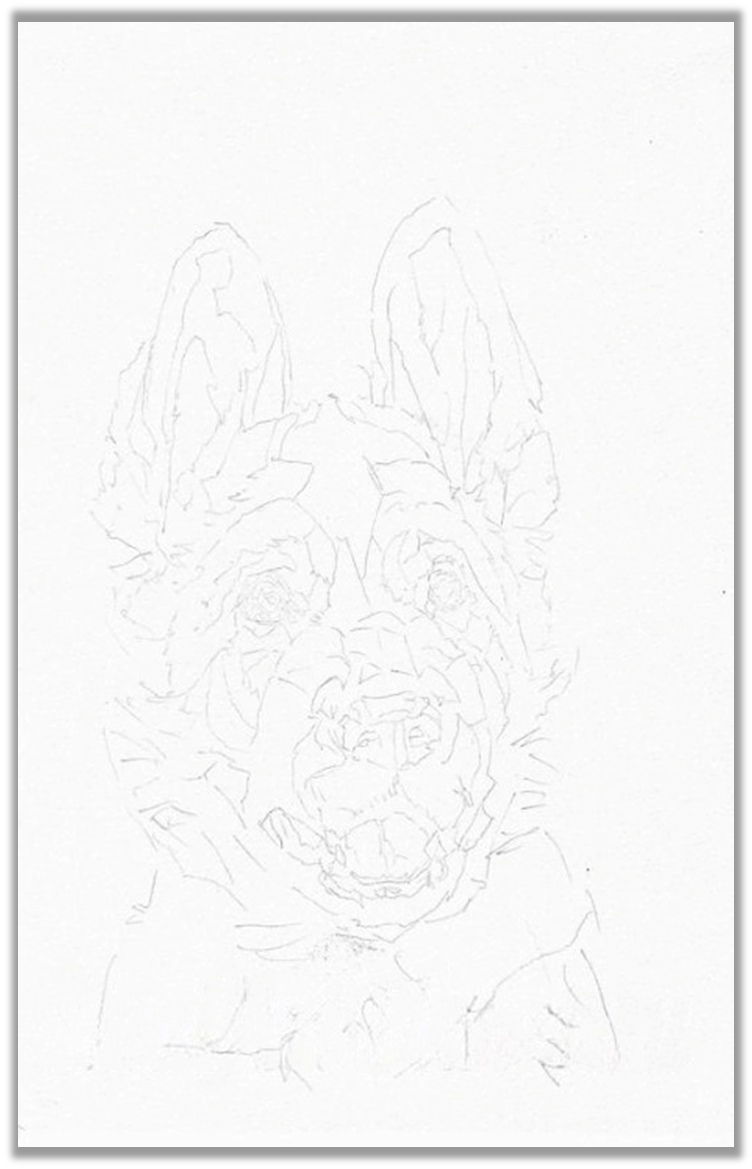 Получаю вот такой лист. Начинаю, естественно, с глаз. Там пока ничего акварельного нет, самые темные места прорисовываю полусухой кистью. Зрач