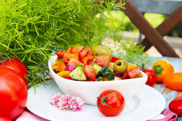 Летний, свежий, сочный и потрясающе вкусный! Салат из помидоров, огурца и болгарского перца - это море витаминов в одной тарелке! Простой в приготовлении и невероятно полезный, из сезонных овощей. Его можно приготовить в виде лёгкого перекуса в летние дни или предложить к мясу, картофелю. Пошаговое приготовление Время приготовления: 10 мин Шаг 1 Как сделать салат из помидоров, огурца и болгарского перца? Подготовьте все заявленные в рецепте продукты. Из сезонных овощей, собранных в огороде салат получится в разы вкуснее и ароматнее. Масло можно использовать оливковое, обычное растительное или рапсовое. Количество каждого из компонентов допустимо регулировать по собственным вкусовым предпочтениям. Итак, все овощи и зелень ополосните в холодной воде и обсушите бумажными салфетками. Шаг 2 Если у огурца грубая кожица, то её следует срезать. Нарежьте огурцы кубиками среднего размера. Вообще способ нарезки овощей может быть абсолютно любым. Салат будет красиво и нарядно выглядет