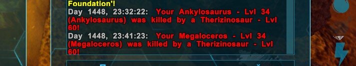 Ну вот, какой чудесный день, какой чудесный пень! В кавычках! Печальная судьба постигла моих новоиспеченных питомцев. На мой маленький загон напал гигантский Теризинозавр 60-го уровня. Столько нервов, стрел, а всё в пустую, мои питомцы пыли под его огромным острыми когтями. В итоге я его одолела, но осталась опять одна, без боевой и добывающей ресурсы силы. Как оказалось, место моей базы - излюбленная точка спавна этих агрессивный травоедов, теризинозавров. Под конец дня я убила четверых гигантов самых разных уровней. Да, в любой ситуации есть свои плюсы: у меня много кожи и в моем холодильнике появилось мясо. Наелась, пора в путь, искать соратников. Походы по малоизученной карте с грифом "Смертельно опасно", захватывающие и пугающие, даже мелкий олень в темноте ночи может напугать. Удивительно, что огромные ленивцы - Мегатерии и Шерстистые носороги мирные и добродушные существа, рядом с которыми можно себя чувствовать в безопасности, а иногда и укрываться за их спиной от хищных живо