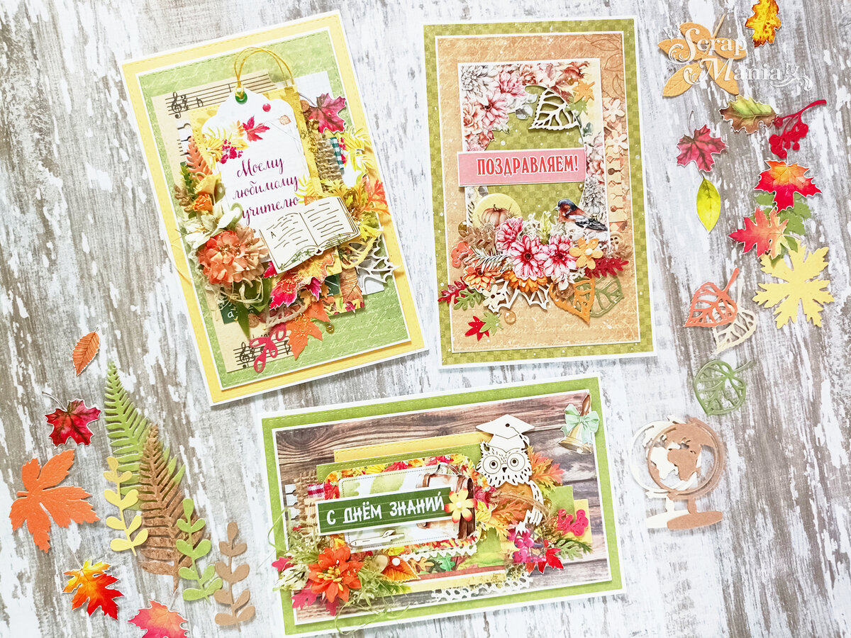 У меня получилось даже не 2, а целых 3 открытки к нашему первому этапу (третья вышла совершенно случайно, честно-честно!) Две основные открытки я сделала из коллекции "Школьный вальс", а третью (бонусную) из нашей новинки - коллекции "Щедрая осень". Зато можно наглядно увидеть, что обе коллекции отлично сочетаются друг с другом.