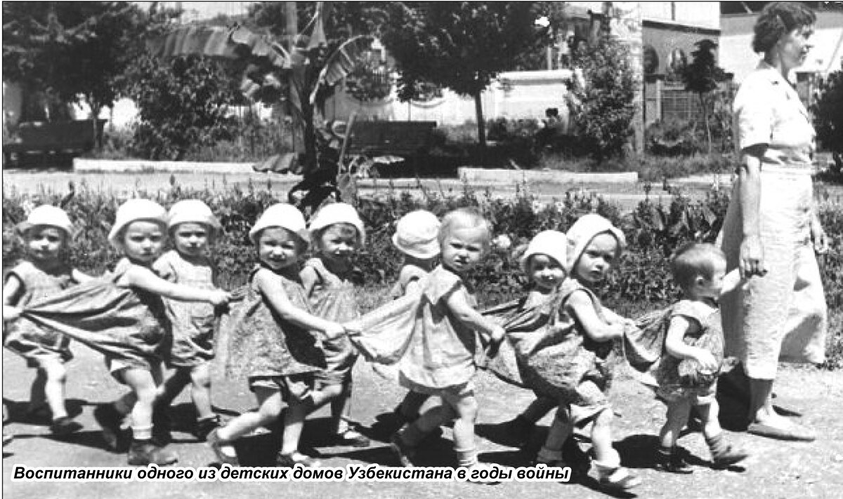 В годы Великой Отечественной войны Узбекистан принял более 250 тысяч эвакуированных детей. В первые дни эвакуации 239 воспитанников детских домов были отправлены в Фергану, 280 – в Андижанскую область, 80 – в Ташкент, 408 – в Бухарскую и Самаркандскую области. В Узбекистан эвакуировали не только детей, но и детские дома. В 1941–42 годах из близлежащих к фронту территорий в Узбекистан были переведены 78 детских домов: 5 из них были размещены в Ташкенте, 10 – в Фергане, 4 – в Самаркандской области, 9 – в Наманганской, 13 – в Андижанской и 9 – в Бухарской... Эвакуированных детей распределяли не только по детским домам, их также принимали и узбекские семьи. Например, руководитель республики Усман Юсупов взял в свою семью троих детей. Были семьи, которые принимали к себе по десять детей. Семья Хамида Самадова из Каттакургана приняла более 10, Фатима Касимова – десятерых, Жураевы и Ашурхужаевы по 8 детей. К концу 1943 года 4672 эвакуированных ребёнка были приняты на воспитание в городские се