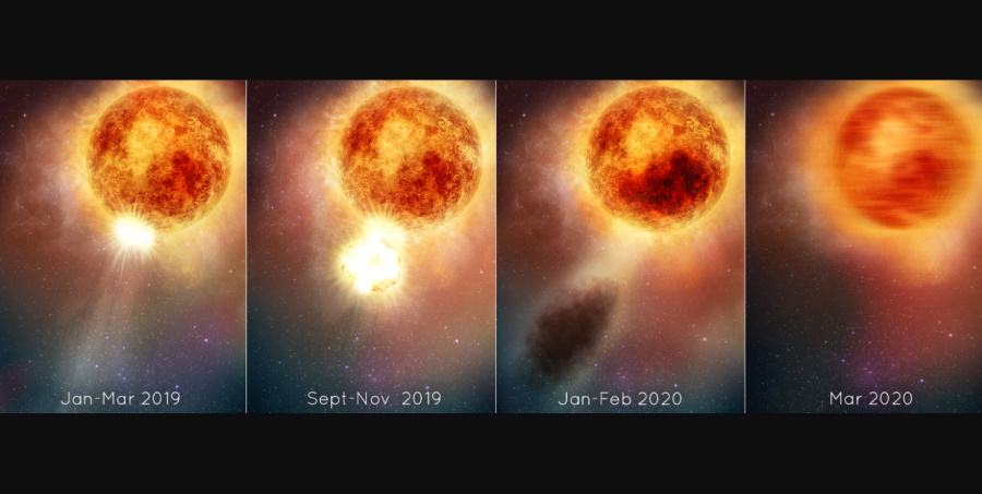 Астрономы пришли к выводу, что у Бетельгейзе — яркого красного сверхгиганта — произошла мощная вспышка, оторвавшая часть звезды от ее поверхности. Этот гигантский поверхностный выброс массы наблюдался в 2019 году. Пока это единственное зарегистрированное событие такого типа. Сейчас звезда медленно возвращается в свое «нормальное» состояние. Бетельгейзе находится примерно в 640 световых годах от Земли и мчится в космосе со скоростью звука. Она настолько огромна, что если бы могла заменить Солнце в центре нашей системы, то ее внешняя оболочка простиралась бы за пределы орбиты Юпитера. Звезда очень яркая и за ней наблюдают сотни лет. Теперь благодаря телескопу «Хаббл» удалось разгадать тайну ее резкого затемнения, наблюдавшегося в 2019 году. Солнце регулярно «выдувает» части своей внешней атмосферы, короны, в результате события, известного как выброс корональной массы (CME). Однако выброс массы Бетельгейзе с поверхности (SME) выбросил в космос в 400 миллиардов раз больше материи, чем типи