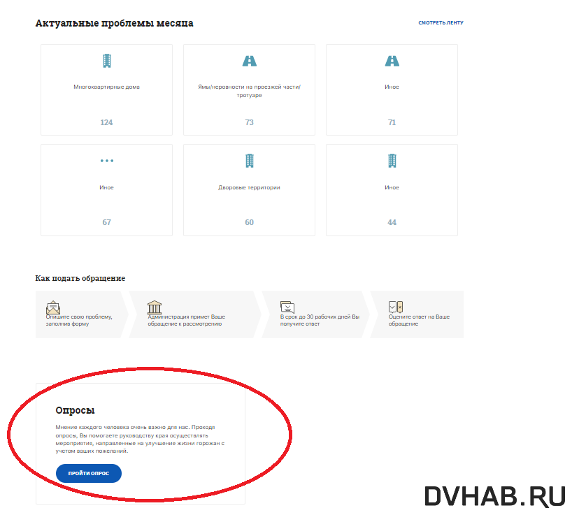 Для того чтобы войти в программу «1000 дворов», сначала нужно пройти онлайн-анкетирование от регионального министерства ЖКХ на платформе голос27.ру во вкладке «Опросы». Она находится в самом низу страницы. Важный момент - нужно привлечь как можно больше людей к этому процессу. К участию в программе допустят самых активных.