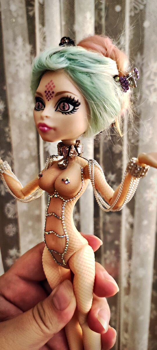 Всем привет ! Меня зовут В.Редная и я обожаю кукол! Добро пожаловать на мой канал! В прошлой статье , я закончила на том, что начала украшать нашу змейку камушками, и сделала ей браслеты. А прежде чем продолжить работу, я решила придумать ей имя. Имя ее Атенаис. Оно ей очень подходит. Ну-с, продолжим) Сделала крепление сверху, присоединила туда цепочки. Получилось очень красиво и воздушно. Посмотрела, и решила закрыть эти палочки торчащие. Сделала доп. украшение. Получилось очень даже красиво, но все еще не то. И дальше, я, как всегда, забыла отфотографировать процесс🙈🙈🙈 По этому этапов не будет, а сразу готовый промежуточный вариант и тела, и самого украшения. Добавила на тело больше зеленых камушков. Добавила сережки, украсила камушками браслеты. Покажу чуть поближе браслеты) И серьги) и личико) А потом я решила ее сфотографировать с распущенными волосами. Посмотреть, как сочетается) По моему, выглядит потрясающе))) Следующий этап - украшаем ноги и спинку. Получается красиво,