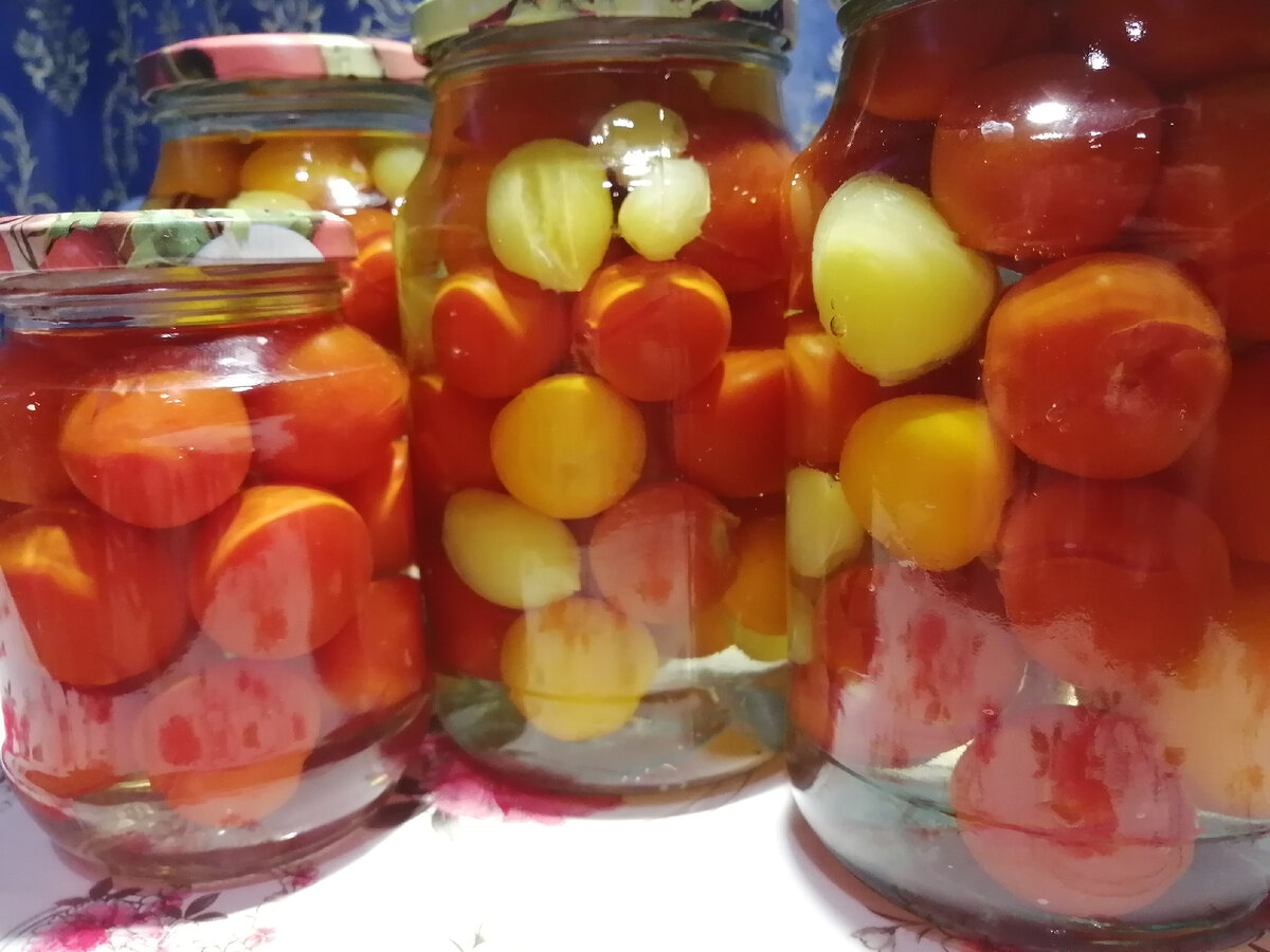 Приветствую вас, дорогие подписчики и гости моего канала. Время заготовок в самом разгаре, и сегодня хочу поделиться своим самым любимым рецептом приготовления помидоров впрок. Помидоры готовятся очень просто и быстро, с минимальным набором специй. В этом рецепте я не использую никаких пряных трав. Помидоры хорошо промываем и слегка обсушиваем. Банки я беру не большие (от 0,5 л до 1 л), стерилизую. Перед укладкой в банки, я срезаю плодоножки у помидор (можно просто проколоть в нескольких местах вокруг нее зубочисткой - кому как нравится). После того, как все плодоножки убраны, укладываю помидоры в банки. Я люблю брать мелкие помидорки. В этом году у меня они трех цветов, а значит, баночки будут еще красивее и аппетитнее. После того, как все банки заполнены, начинаем варить маринад. Для этого в одном литре воды растворяем 4 столовых ложки сахара и 3 чайных ложки соли. Этот раствор доводим до кипения. Добавляем 60 мл уксуса (9%) и разливаем по банкам. Если у вас банки не стерилизованные