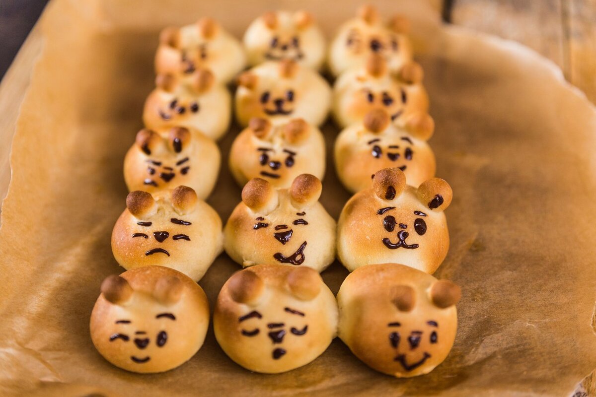 Пшеничная мука 360 г Теплая вода 220 мл Сухие дрожжи 6 г Сахар 30 г Соль 4 г Сливочное масло 30 г Растопленный шоколад 30 г 1) Соедините сахар, воду и дрожжи. 2) В отдельную емкость просейте муку с солью. 3) Соедините жидкую смесь с сухой и тщательно перемешайте. Замесите эластичное и гладкое тесто. 4) Добавьте масло и еще раз вымесите тесто. 5) Поместите в чистую миску и оставьте подходить. 6) Тесто аккуратно разделите на 15 равных частей. Затем разделите каждый кусочек на 3 части. Округлите каждую заготовку и оставьте на 15 минут. Слегка сплюсните заготовки и снова округлите. 7) Скрепите заготовки между собой и поставьте на противень. Накройте слегка влажным полотенцем и дайте немного постоять. 8) Выпекайте в разогретой духовке 11 минут. 9) Дайте булочкам остыть. Оформите мордочки мишек шоколадом. Приятного аппетита!