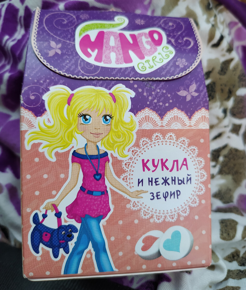 Коробочка с сюрпризом попалась мне на кассе магазина Авоська. На коробочках изображены разные персонажи серии (по два на каждой). Я взяла вот с такими картинками: Забавно, что в серии Манго Girls (=девочки), да ещё и лучшие подружки, есть один пацан. Выходные данные Состав набора: пакетик с маршмеллоу, пакетик с игрушкой и вкладыш книжечкой На вкладыше с обратной стороны видно всех персонажей серии. На мой вкус, очень милые ребята. Мне попалась легенда Ники Игрушка в полупрозрачном пакете И... оп! А это не Ника, а София Рассмотрим её со всех сторон: На планшете логотип фирмы. Мне очень понравилось, что резиночки на волосах разноцветные. В целом, сюрпризом довольна, тем более менее 100 р. Плюсы: Минусы: Я пока не решила, буду ли собирать серию целиком, но скорее всего куплю ещё, если попадется.