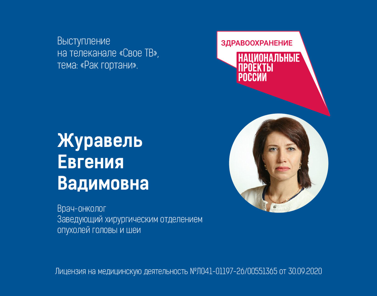 Напомним, что в Ставропольском крае продолжается реализация регионального проекта «Борьба с онкологическими заболеваниями» нацпроекта «Здравоохранение». Он позволяет повышать качество медицинской помощи с применением передовых лечебно-диагностических практик. Рак гортани – злокачественная опухоль, развивающихся в органах дыхания и прилегающих структурах горла (миндалинах, голосовых связках, надгортаннике). ▪️Как часто выявляют этот вид онкологии у жителей Ставропольского края? Этот и другие вопросы подробно обсудили в новом выпуске программы «За здоровье». Гостьей передачи стала заведующая отделением опухолей головы и шеи (хирургическим) кандидат медицинских наук, врач высшей квалификационной категории Евгения Вадимовна Журавель. 👩⚕️ Будьте здоровы! Присоединяйтесь к социальным сетям: