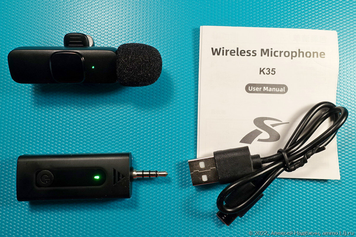 Беспроводные петлички всегда стоили дорого, да и сейчас модели известных брендов могут стоить и 5, и 15 и 30 тысяч рублей, при этом на Aliexpress появилось множество цифровых радиопетличек по очень низким ценам. Я купил такую и изучил. Этот микрофон сейчас стоит всего 695 рублей (в этом же лоте есть микрофоны с подключением к разъёму смартфона Type C или Lightning ещё дешевле). В другом лоте того же продавца он чуть дороже, но там очень много отзывов. Какое-либо название бренда отсутствует, на инструкции написано "K35". Микрофон приходит без коробки, в пакете лежит сам микрофон-передатчик, приёмник, зарядный кабель USB-Type C и инструкция на английском и китайском. Для включения нужно нажать и подержать кнопки на микрофоне и на приёмнике. Пока включено только что-то одно (приёмник или передатчик), светодиод на нём будет менять цвет с зелёного на красный. Как только включатся оба устройства и установят связь между собой, светодиоды станут зелёными. Приёмник оснащён разъёмом 3.5 мм 4 pin