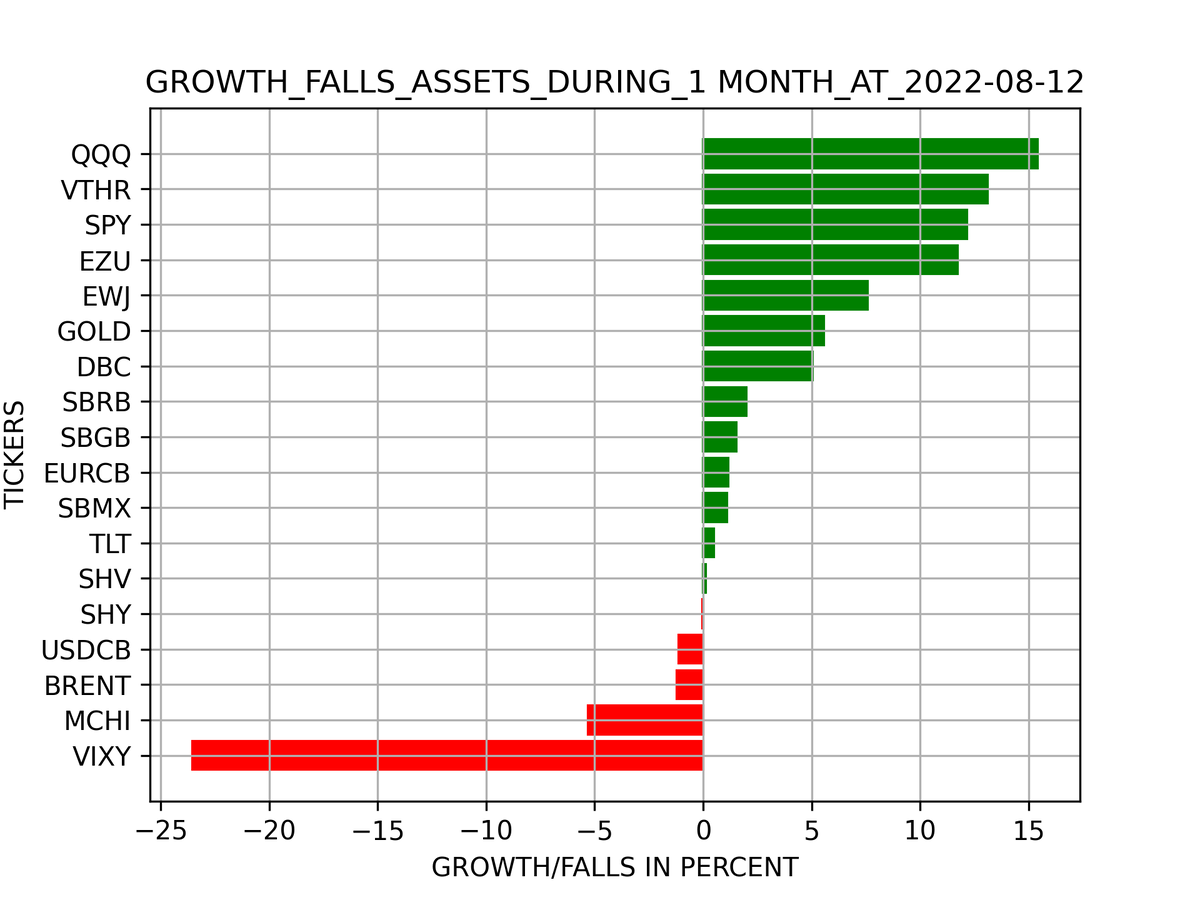 Доходность посчитана на срок: ✅ неделя ✅ 1 месяц ✅ 1 квартал ✅ Полгода ✅ 9 месяцев ✅ 1 год ✅ к началу года Активы представленные в расчете: ✅ SBMX – биржевой фонд, копирующий индекс IMOEX с учетом дивидендов, которые платят компании, входящие в индекс ✅ SBRB – биржевой фонд, копирующий индекс рублевых корпоративных облигаций с учетом купонов по ним ✅ SBGB – биржевой фонд, копирующий индекс рублевых государственных облигаций с учетом купонов по ним ✅ SPY – ETF с учетом реинвестирования дивидендов, копирующий индекс S&P500 ✅ QQQ — ETF с учетом реинвестирования дивидендов, копирующий индекс NASDAQ ✅ SHV — ETF с учетом реинвестирования дивидендов, копирующий индекс коротких государственных облигаций США, сроком до 1 года ✅ SHY — ETF с учетом реинвестирования дивидендов, копирующий индекс среденсрочных государственных облигаций США, сроком от 1 года до 3 лет ✅ TLT — ETF с учетом реинвестирования дивидендов, копирующий индекс долгосрочных государственных облигаций США, сроком более 20 лет ✅