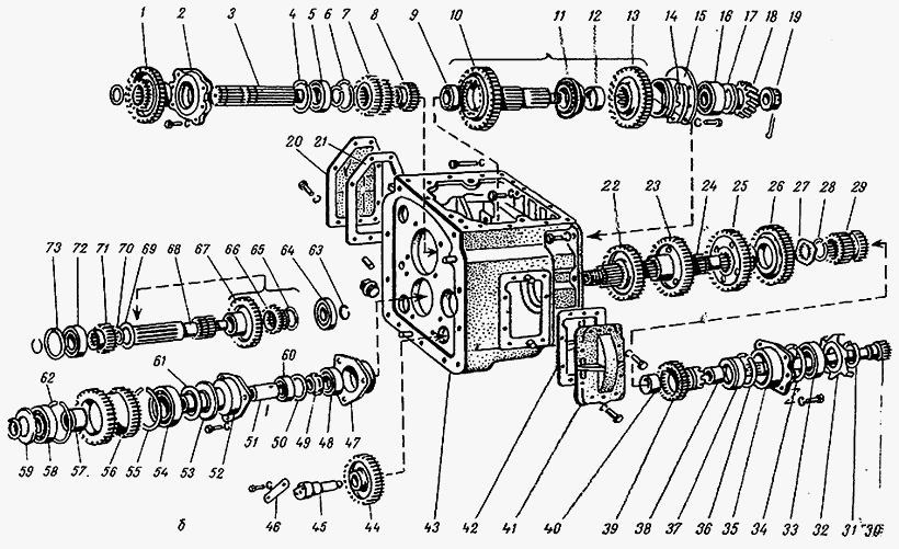 13 – пробка для залива. 14 – опора шаровая. 15 – рычаг переключения КПП. 16 – защитный кожух. 17 – штифтовый элемент. 18 – рамочная деталь. 19 – валик. 20 – шариковый переключатель. 21 – выключатель. 22 – регулировочные прокладки. 23 – уплотнители корректирующие. 24 – гайка. 26 – шестерня ведущая. 27/29 – подшипники конической конфигурации. 28 – шайба упорная. 30 – крыльчатка. 31 – седло внутреннего валика. 32 – втулка. 33 – вал внутренний. 34 – подшипниковая группа. 35 – втулка. 36 – шестерня 2 ступени редуктора. 37 – шестерня 1 ступени. 38 – шестеренка промежуточная. 39 – подшипник. 40 – шестерня 3 передачи. 41 – ведомый зубчатый элемент 4 диапазона. 42 – шестеренка заднего хода. 43 – ось. 44 – шестерня 5 передачи. 46 – ось. 47 – шестеренчатый элемент редуктора понижающего.