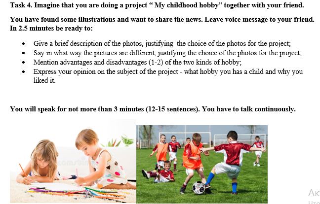 В задании 4 экзаменуемым предлагается проблемная тема для проектной работы и 2 фотографии. Нужно оставить голосовое сообщение другу, в котором необходимо объяснить выбор данных иллюстраций и выразить свое мнение по проблеме проектной работы. Студенты могут опираться на план,предложенный ниже.