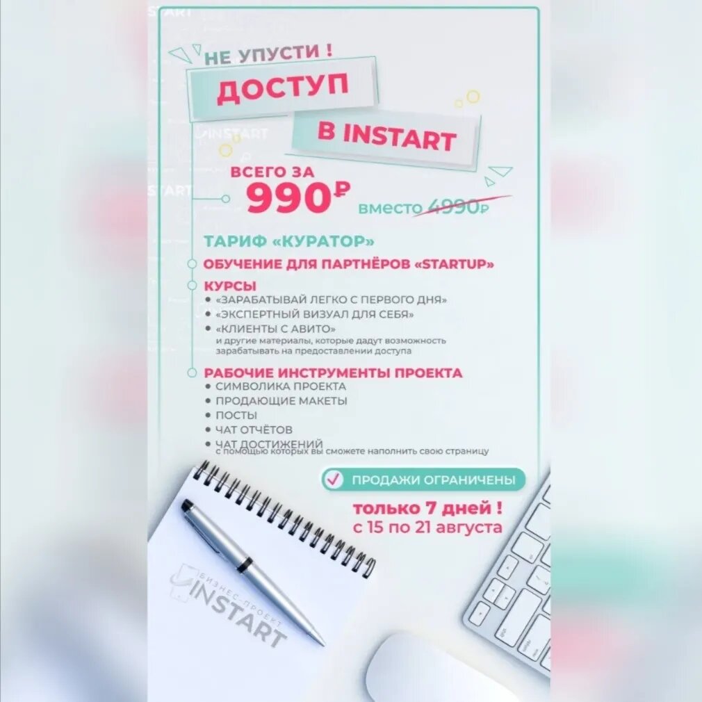 📣Это горячее предложение будет действовать только 7 дней — с 15 по 21 августа🔥 Данный тариф можно приобрести по Спец цене всего за 990₽ (вместо 4990р) 🎁Бонусом вы получите три курса, стоимостью⤵️ ✔️"Зарабатывай легко с первого дня" - 890₽ ✔️"Экспертный визуал для себя" - 690₽ ✔️"Клиенты с АВИТО"-390₽ Во время обучения ты уже сможешь получить свой первый dоход в онлайн💯 🟡В ДОСТУПЕ Чаты - помощники : - "Отчёты и Достижения " - "Посты" -" Символика " -" Макеты " -" Отчёты"⠀ ДОСТУП ко всем материалам тарифа предоставляется только на 2 месяца!!! A также только в течении 2-х месяцев с момента активации ключа можно перейти на тариф 1, 2 или 3 со скидкой🔥 Не упусти шанс воспользоваться таким классным предложением! Пиши 👉