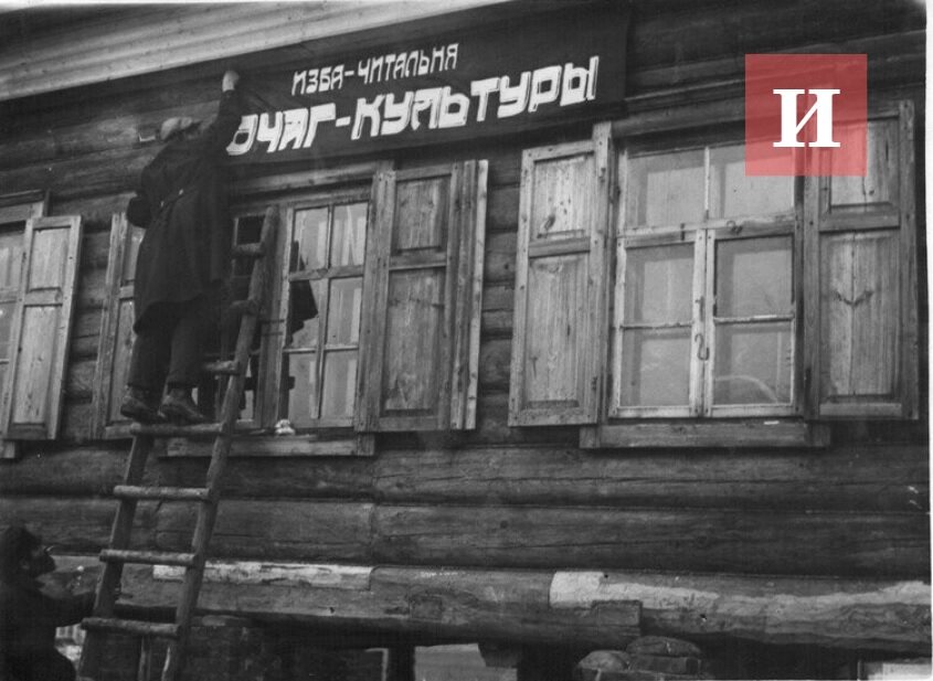 Попробуйте обратиться к знакомой женщине-библиотекарю «избачка» и посмотрите, что будет. Только поделитесь потом с нами впечатлениями, интересно же. На фото открытие избы-читальни в деревне Аминьево. Скорее всего 1920-е годы. Кстати, большинство районных библиотек выросло именно из таких «очагов культуры».