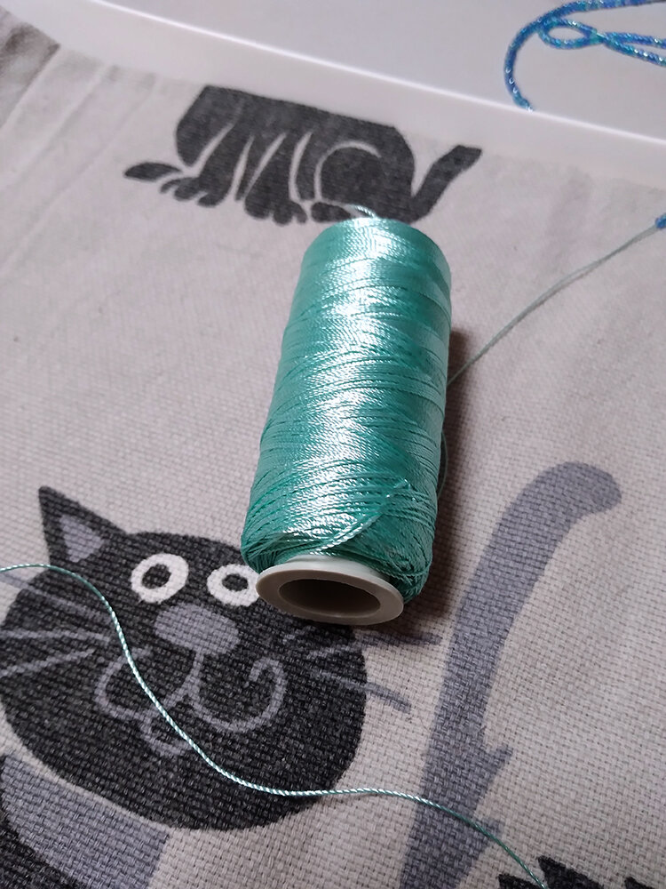 Иногда у меня остается по 5-10 грамм бисера разных цветов, которые никуда особо не употребишь. В таком случае я решаю, что настало время "ленивых жгутов" - вязаных украшений без какой-либо схемы. Беру синтетическую нить, у меня это нейлон Kaplan. И длинную иглу с хитрой конструкцией. В саму иглу продета тоненькая нитка для шитья. Она замыкается сама на себя, а в получившуюся "петлю" вставляется наша бисерная нить. Перемешиваю свои остатки бисера и начинаю методично нанизывать на нитку, отметая бракованные бисеринки. На последнем фото стрелкой указано, как бисерины с тонкой петли соскальзывают на нужную нитку. Не забывайте придерживать свободный конец нити, чтобы он не ускользнул. Дальше я вяжу жгут, по 7-8-9 бисерин в кольце, по настроению. Вяжу самым простым способом, полустолбиком по спирали, по этой технике есть множество обучающих видео в интернете. В итоге получается вот такая вот "колбаска". В моем случае результат получился довольно коротким, поэтому это будет не лариат, а колье