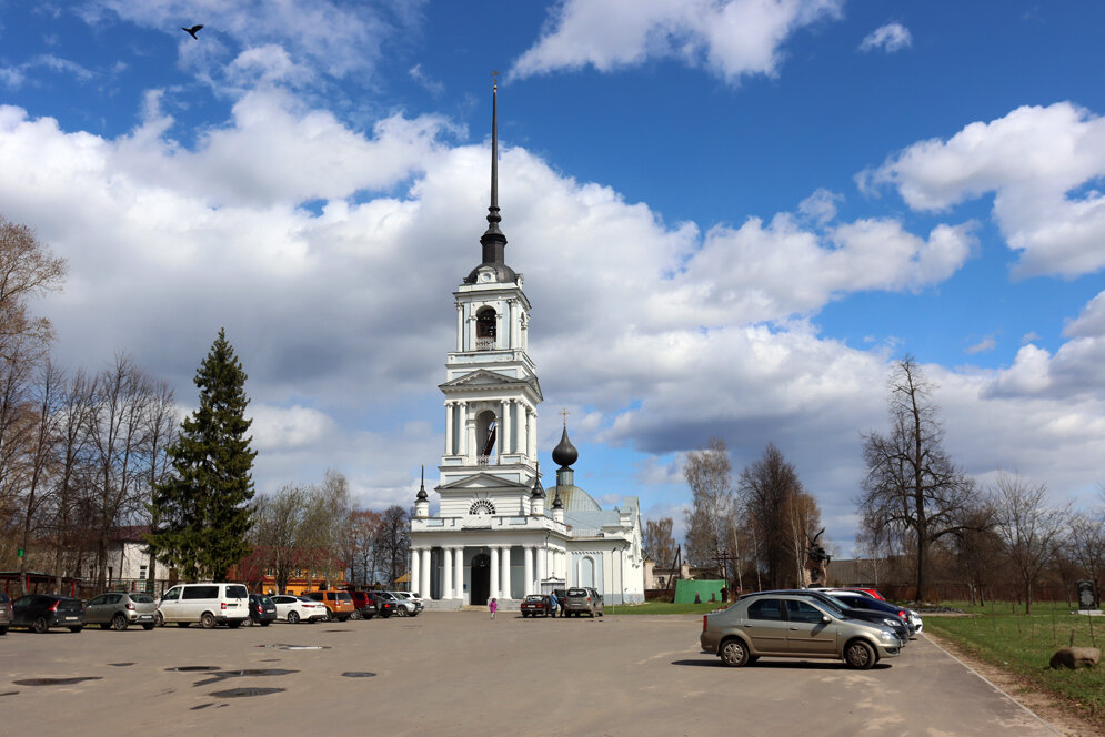1. На самом въезде в оставшуюся от исторического центра Калязина часть, нас встретил величественный Храм Вознесения Господня. В 1783 году, на отведенном для городского кладбища месте, устроена каменная церковь в честь Вознесения Господня, а в 1784 году к ней пристроили два придела в честь Тихвинской Божией Матери и преподобного Макария, Калязинского чудотворца. Позднее между ними возник третий престол - в честь Успения Божией Матери. В храме свято чтилась икона Тихвинской Божией Матери - точный список с чудотворной, находившейся в Новгородском Тихвинском мужском монастыре. Граждане Калязина имели такое усердие к этой иконе, что обычно весь храм называли Тихвинским. Другой свято чтимой иконой являлась икона преподобного Макария с изображением в клеймах 24-х эпизодов из жизни чудотворца от рождения его до смерти. В икону была вложена частица его мощей.