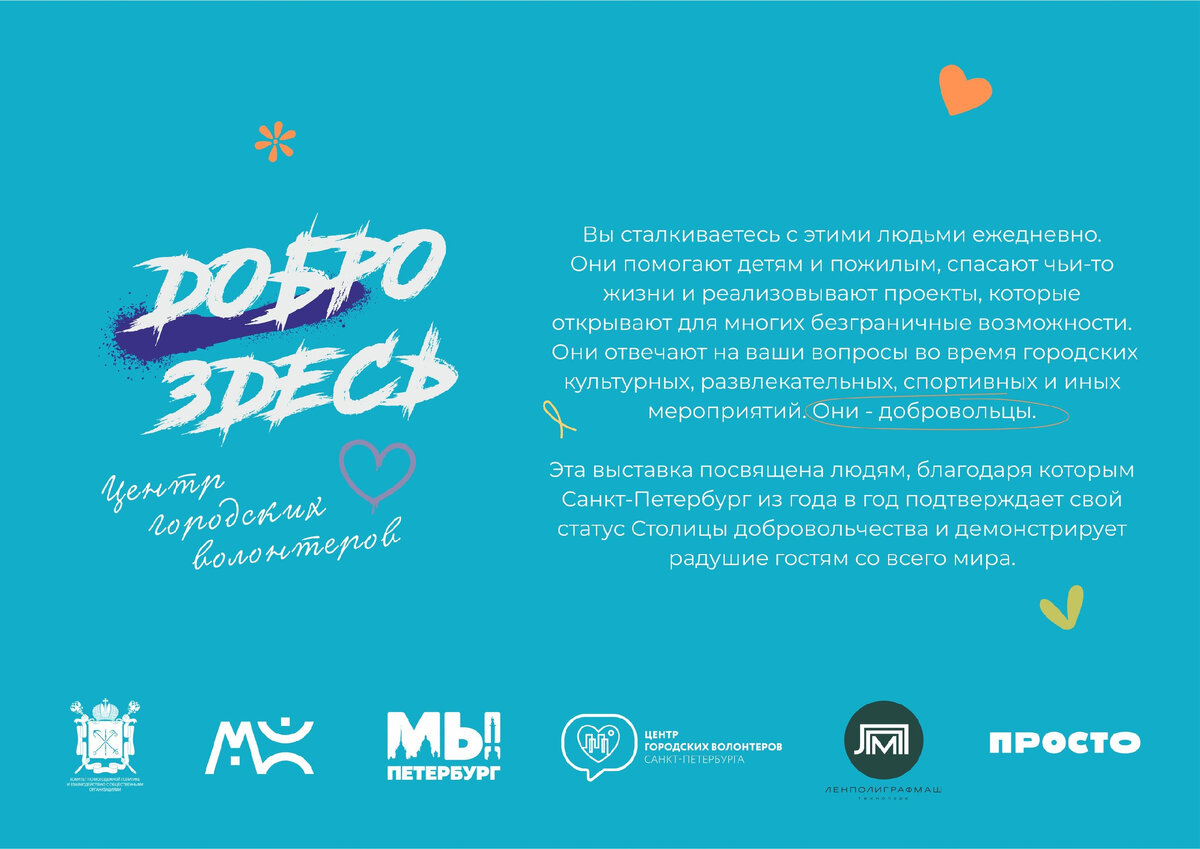 Фотовыставка посвящена людям, благодаря которым Санкт-Петербург из года в год подтверждает свой статус «столицы добровольчества» и демонстрирует радушие гостям со всего мира. Экспозиция будет открыта к посещению для всех желающих до 31 августа