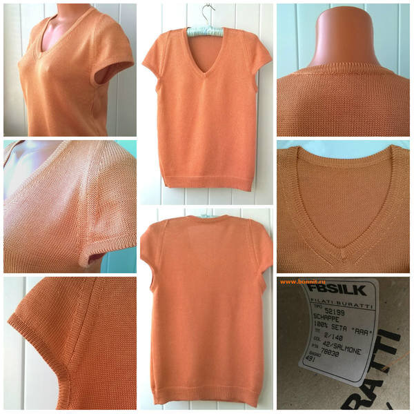 Майка связана из 100% шелка 2/140 в 15 сложений ( суммарная толщина 500 метров/100 грамм), петельная проба кулирной глади 10х10 см при плотности 5 - 31 петля в ширину и 44 ряд в высоту. В мастер-классе подробное пошаговое иллюстрированное описание процесса вязания - как вязать горизонтальную вытачку частичным вязанием, расчет проймы и рукава покроя полуреглан, использование фасонных убавок при вязании проймы, окатов и выреза горловины, ВТО деталей, последующая сборка и обработка кеттлевочными бейками V-образной горловины и пройм. Мастер-класс написан на 6 размеров в 3 вариантах: 1) размеры 42 и 44 2) размеры 46 и 48 3) размеры 50 и 52 Каждый вариант состоит из 4 файлов - описания в pdf-формате, 2 схемы-выкройки на каждый размер и zip-папки с крупными фото. Мастер-класс на весь размерный ряд из 10 файлов - 3 описания, 6 схем-выкроек и zip-папка с фото. Описание на 2 размера выглядит примерно так:" набор 73х73 (77х77) игл , убавить 4 (6) петель, глубина проймы 20 (21) см" и т.д., где пер