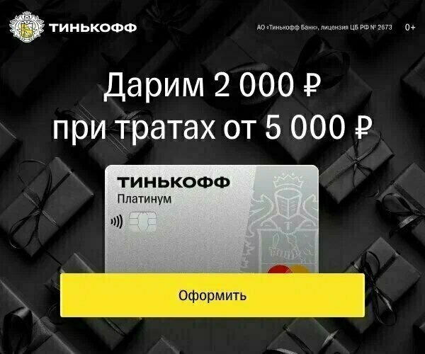 ОФОРМИТЕ ЗАЯВКУ НА КАРТУ-ОНЛАЙН 2000 руб. Получите(потрать от 5000 руб) за Бесплатную НАВСЕГДА Кредитную карту Platinum до 55 дней без % до 700 000 ₽ от Т и н ь к о ф ф Банка оформите-онлайн по ПАСПОРТУ РФ по 31 августа 2022 г.(ВКЛЮЧИТЕЛЬНО) + Бесплатная доставка Вернем 2000 ₽, если потратите 5000 ₽ за месяц после активации карты оформите-онлайн по 31 августа 2022 г. ОФОРМИТЕ ЗАЯВКУ НА КАРТУ-ОНЛАЙН 120 дней За погашение картой других кредитов-ТОЛЬКО ЧЕРЕЗ ОПЕРАТОРА или ЧАТ, До 12 месяцев За технику, одежду и другие покупки в рассрочку Обслуживание карты НАВСЕГДА — 0 ₽ не более 8% от задолженности, минимум 600 руб. - Минимальный платеж ОФОРМИТЕ ЗАЯВКУ НА КАРТУ-ОНЛАЙН Кредитная карта Тинькофф Платинум УТП по карте: Рассрочка без % до 12 месяцев на любые покупки; Оформление кредитной карты за 5 минут; Лимит до 700 000 ₽; Обслуживание от 0 ₽; Беспроцентный период до 55 дней за любые покупки; Кэшбэк до 30% баллами за любые покупки; Пополнение бесплатно.на правах рекламы на правах рекламы 1