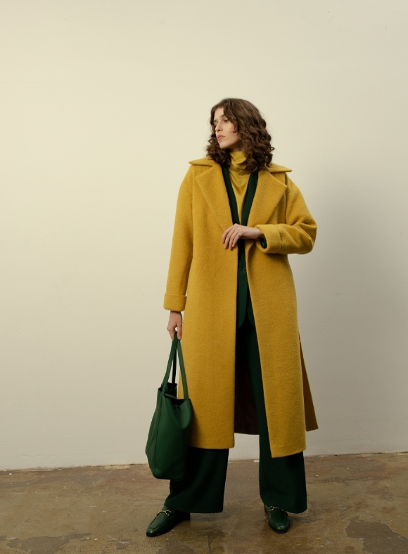 Артикул: 44468211 Дизайнерское пальто горчичного цвета из валеной шерсти выделит вас из толпы. Длина 125 см, присутствует шлица. Длинные рукава, можно носить с отворотом. Данная модель свободного стиля оверсайз с широкой проймой и спущенным плечом, халатного типа. Теплый вариант для городских модниц. Купить Здесь RAVETTI/Пальто.