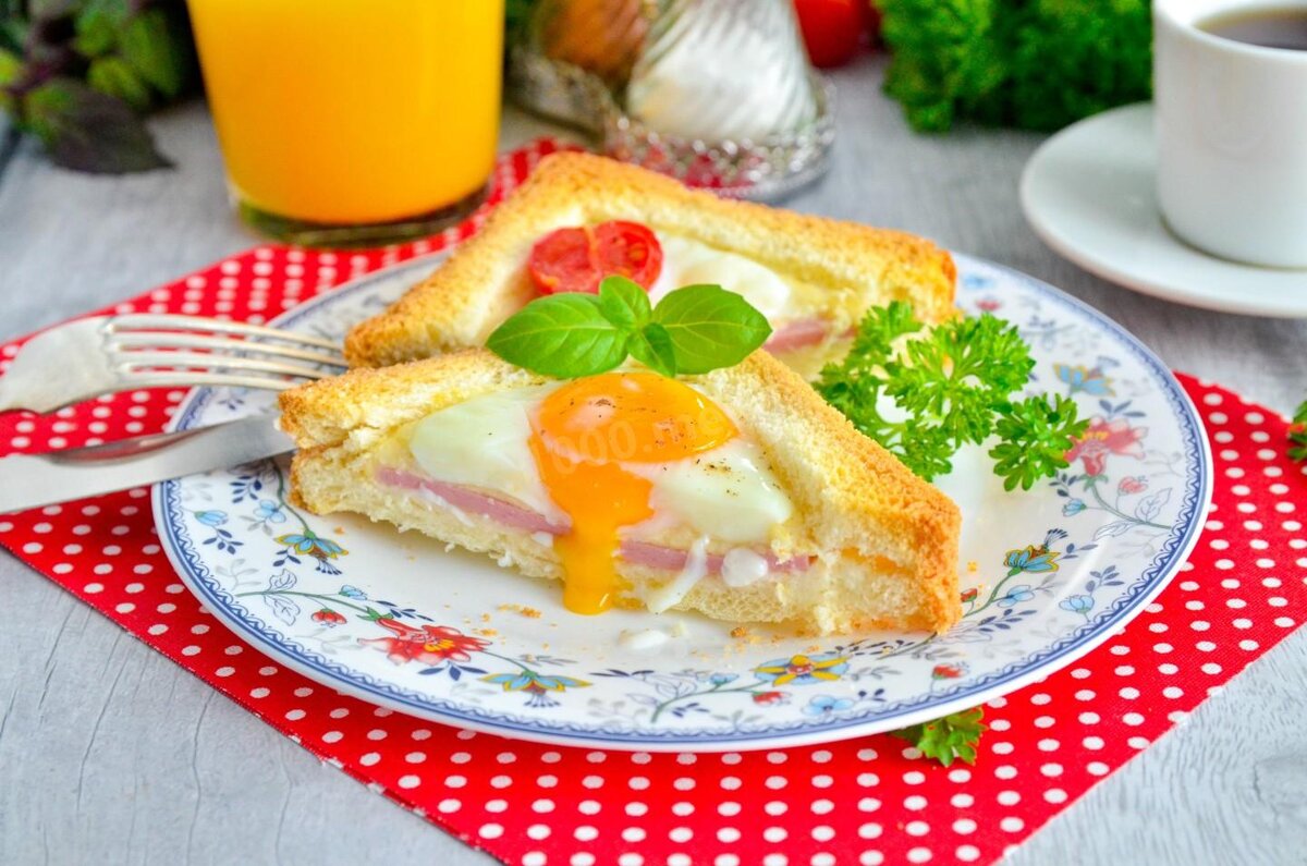 Быстро, просто, из обычных продуктов, на завтрак! Горячие бутерброды с яйцом в духовке — рецепт сытного и вкусного блюда, которое легко приготовить к утренней трапезе. Времени на подготовку у вас уйдет меньше 5 минут, остальное все сделает духовка. Бутерброды понравятся всем — и взрослым, и детям. Рецепт: НА 2 ПОРЦИЙ: ПОШАГОВОЕ ПРИГОТОВЛЕНИЕ: ШАГ 1: Как сделать горячие бутерброды с яйцом в духовке? Подготовьте продукты. Хлеб лучше всего подойдет тостовый, квадратный, тогда бутерброды получатся аккуратными и ровными. Я взяла вареную колбасу, но вообще подойдет и ветчина, и любое мясо. Очень удобно использовать готовую нарезку. ШАГ 2: Сразу включите разогреваться духовку на 180°С, пока вы собираете бутерброды, она будет готова. Возьмите два кусочка хлеба и вырежьте из них серединки, оставив по краям бортик шириной чуть больше сантиметра. Два оставшихся куска оставьте целыми. Из вырезанных серединок сделайте сухарики. ШАГ 3: Сыр натрите на средней терке. Сыр для этого блюда подойдет любой