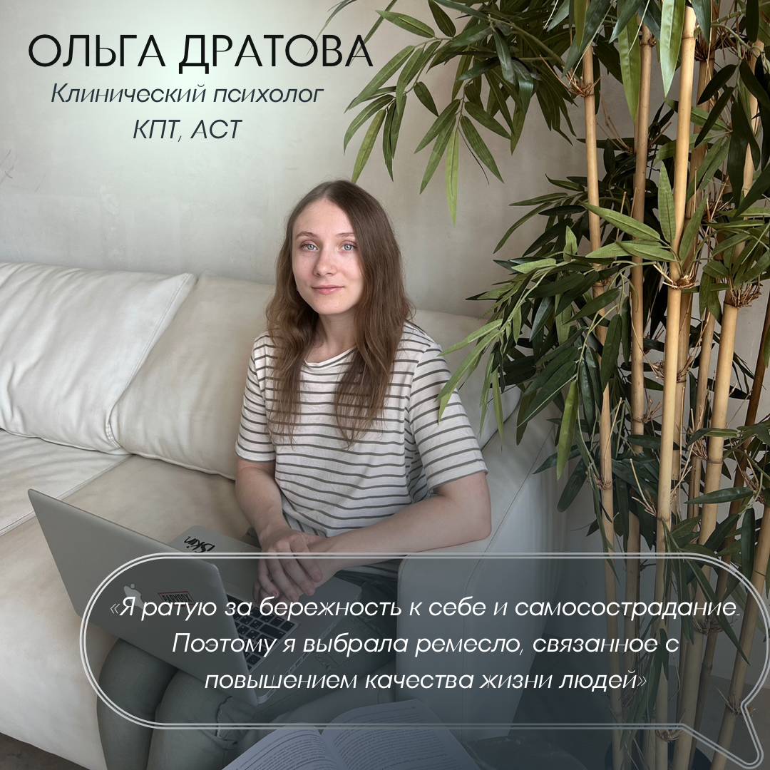 Помните, наша команда пополнилась классными специалистами? Пришло время для знакомства! Ольга Дратова, клинический психолог: «Уважать свои желания и гармонично воплощать их в жизнь, творчески приспосабливаться к последствиям случайностей и неопределённостей мира, реализовывать свой потенциал, чувствовать связь с единомышленниками, наслаждаться жизнью – это всё про здоровье, психическое и психологическое благополучие. Очень здорово, что наука продвинулась вперёд в понимании работы психики. В опоре на эти знания и благодаря специальным навыкам можно улучшить свою жизнь. Я буду рада в этом помочь! У меня есть опыт, уверенность, желание, а также профессиональная поддержка коллег. Ключевое слово: помочь. Потому что менять свою жизнь к лучшему будете именно Вы. Будьте здоровы!» Помогаю в темах: 🔸 тревожная и депрессивная симптоматика; 🔸 расстройство адаптации (утрата близкого, потеря работы, переезд и пр.); 🔸 социальная тревога, сложности с самопрезентацией и самооценкой; 🔸 пристрастия